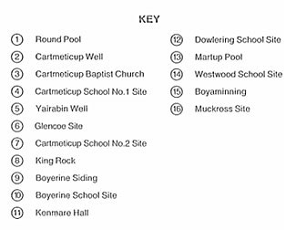 It is situated in the bed of the Moojebing Creek about 1km south of its junction with the Boyerine Creek and a similar distance from the Woodanilling townsite. The spring runs all the year and creates a pool some six metres long, two metres wide and about a metre deep in the creek bed. The water level is about a metre below the surface as heavy creek flows have eroded a channel between the Casuarinas which line the banks of the pool. The spring is located in the centre of Williams location 281 of 100 acres originally taken up as a special lease (no. 55).